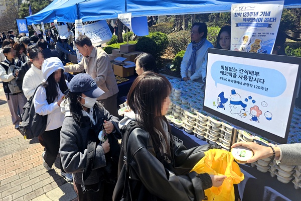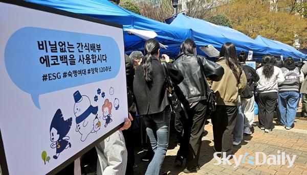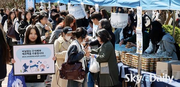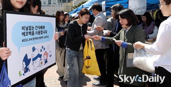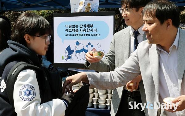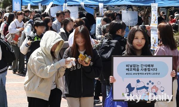 ¡ã 7ÀÏ ¼­¿ï ¿ë»ê±¸ ¼÷¸í¿©ÀÚ´ëÇб³ ¼øÇå°ü ±¤Àå¿¡¼­ ¿­¸° Áß°£°í»ç ÀÀ¿ø °£½Ä ¹èºÎ Çà»ç¿¡¼­ ÇлýµéÀÌ ÀڽŵéÀÌ µé°í ¿Â ¿¡Äڹ鿡 °£½ÄÀ» ´ã°í ÀÖ´Ù. ÃÖ±Ù Áßµ¿ ÀüÀï ¿©ÆÄ·Î ÀÎÇÑ ºñ´Ò ¿ø·á ¼ö±Þ³­ÀÌ Áö¼ÓµÇÀÚ, Çб³ ÃøÀº ȯ°æ º¸È£¿Í ÀÚ¿ø Àý¾àÀ» À§ÇØ ¡®ºñ´Ò ¾ø´Â °£½Ä ¹èºÎ¡¯ Ä·ÆäÀÎÀ» ÁøÇàÇß´Ù. ÀÌÁ¾¿ø ±âÀÚ ¨Ï½ºÄ«À̵¥Àϸ®