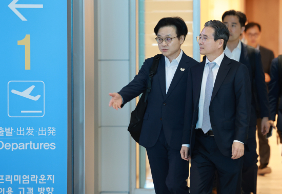 ¡ã ±è¿ë¹ü ´ëÅë·É½Ç Á¤Ã¥½ÇÀå°ú ±èÁ¤°ü »ê¾÷Åë»óÀÚ¿øºÎ(»ê¾÷ºÎ) Àå°üÀÌ 16ÀÏ ÇÑ¹Ì °ü¼¼Çù»ó ³íÀǸ¦ À§ÇØ ¹Ì±¹Çà ºñÇà±â¿¡ ¿Ã¶ú´Ù. ¿¬ÇÕ´º½º