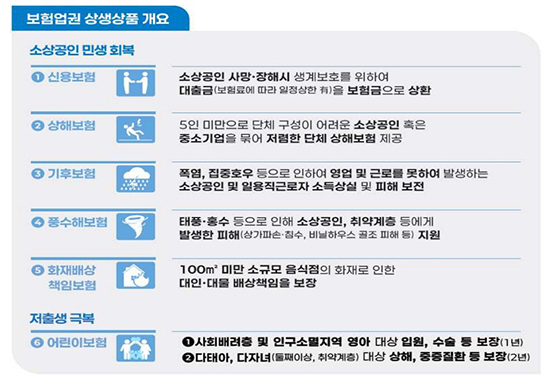¼Ò»ó°øÀÎÀ» ´ë»óÀ¸·Î ÇÏ´Â »õÃâ¹ß±â±Ý 乫Á¶Á¤ ½Å¿ë»óÇØº¸ÇèÀº ÈÄÀ¯Àå¾Ö ½Ã 乫¾×À» º¸Çè±ÝÀ¸·Î Áö±ÞÇÏ°í ºñÀÚ¹ßÀû Æó¾÷ ½Ã ½Ç¾÷º¸Çè±ÝÀ» Á¦°øÇØ ¾à 11¸¸7000 ¸íÀ» 3³â°£ Áö¿øÇÏ´Â ¹æ¾ÈÀÌ Æ÷ÇԵƴÙ. 5ÀÎ ¹Ì¸¸ ¼Ò»ó°øÀÎ ´Üü »óÇØº¸Çè(»ç¸Á 2000¸¸ ¿ø, 3´ë CI 1000¸¸ ¿ø)°ú ½ÖµÕÀÌ¡¤Ãë¾à ´ÙÀÚ³à °¡±¸ ´ë»ó »ó»ý ¾î¸°À̺¸Çè(ÀÀ±Þ½Ç ³»¿øºñ, ¹è»óÃ¥ÀÓ, ÀÔ¿ø ÀÏ´ç µî º¸À塤2³â)µµ Áö¿ø ¸ðµ¨·Î Á¦½ÃµÆ´Ù.