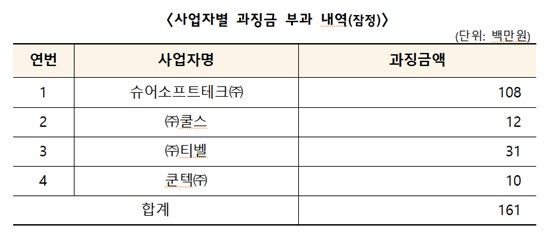 °øÁ¤°Å·¡À§¿øÈ¸´Â 10ÀÏ ¼ÒÇÁÆ®¿þ¾î Å×½ºÅ· ½Ã½ºÅÛ ÀÔÂû¿¡¼ »çÀü ´ãÇÕÀ» ÇÑ 4°³ »ç¾÷ÀÚ¿¡ ´ëÇØ ½ÃÁ¤¸í·É ¹× °ú¡±Ý ÃÑ 1¾ï6100¸¸ ¿ø(ÀáÁ¤)À» ºÎ°úÇß´Ù°í ¹àÇû´Ù.