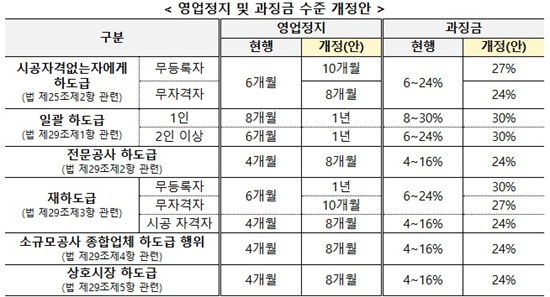 °³Á¤¾ÈÀº ÀÌ¿Ü Àü¹®°ø»ç Çϵµ±Þ, ÀçÇϵµ±Þ, ¼Ò±Ô¸ð°ø»ç Á¾ÇÕ¾÷ü Çϵµ±Þ, »óÈ£½ÃÀå Çϵµ±Þ µî °¢ À§¹Ý À¯Çüº°·Î ¿µ¾÷Á¤Áö ÃÖ¼Ò ±â°£À» ¸ðµÎ ±âÁ¸º¸´Ù 2¹è ÀÌ»ó ´Ã¸®°í, °ú¡±Ýµµ 24~30%·Î »óÇâ Á¶Á¤Çß´Ù.