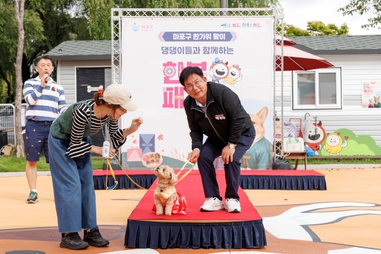 ¡ã ¹Ú°­¼ö(¿À¸¥ÂÊ) ¸¶Æ÷±¸Ã»ÀåÀÌ ´ó´óÀÌ ÇѺ¹ ÆÐ¼Ç¼î¿¡¼­ ÇѺ¹À» ÀÔÀº ¹Ý·Á°ß°ú ÇÔ²² Æ÷Á ÃëÇϰí ÀÖ´Ù. ¸¶Æ÷±¸