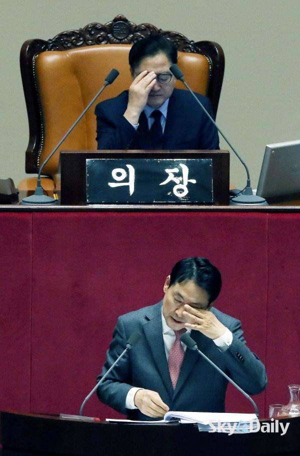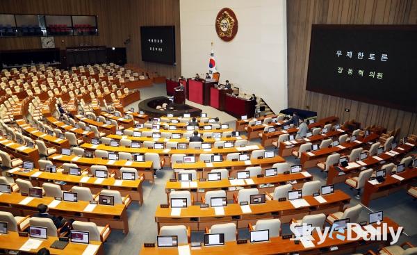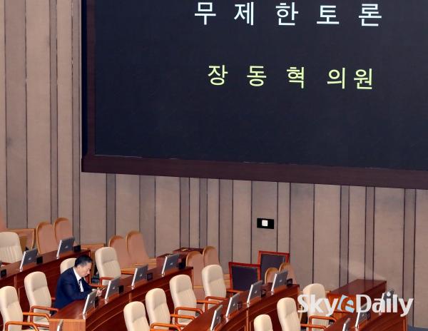 ¡ã À嵿Çõ ±¹¹ÎÀÇÈû ´ëÇ¥°¡ 23ÀÏ ¿ÀÀü ¼­¿ï ¿©Àǵµ ±¹È¸¿¡¼­ ¿­¸° Á¦430ȸ±¹È¸(ÀÓ½Ãȸ) Á¦2Â÷ º»È¸ÀÇ¿¡¼­ ¡®³»¶õÀü´ãÀçÆÇºÎ¼³Ä¡ °ü·Ã ¹ý¾È¡¯¿¡ ´ëÇÑ ¹«Á¦ÇÑÅä·Ð(Çʸ®¹ö½ºÅÍ)¸¦ ÇÏ´Â µµÁß¿¡ ÇǰïÇÑ µí ´«À» ºñºñ°í ÀÖ´Ù. À̳¯ Àå ´ëÇ¥´Â 24½Ã°£À» ä¿ì¸ç 23ÀÏ ¿ª´ë ÃÖÀå Çʸ®¹ö½ºÅÍ ±â·ÏÀ» ¼¼¿ü´Ù. Àå ´ëÇ¥ÀÇ Çʸ®¹ö½ºÅ͸¦ ÁöÄÑ º» Á¤¼ºÈ£ ¹ý¹«ºÎ Àå°üÀº ÀÚ½ÅÀÇ SNS¿¡ ¡°´ëÈ­ ŸÇùÀÌ ½ÇÁ¾µÈ ¿ì¸® Á¤Ä¡ÀÇ Çö½Ç¡±À̶ó°í ¿Ã·È´Ù. ¹Ú¹Ì³ª ±âÀÚ ¨Ï½ºÄ«À̵¥Àϸ®