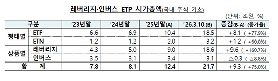±ÝÀ¶°¨µ¶¿ø¿¡ µû¸£¸é ÀÌ´Þ 10ÀÏ ±âÁØ ±¹³» ÁÖ½Ä ±âÃÊ ·¹¹ö¸®Áö ¹× Àιö½º »óÀåÁö¼ö»óǰ(ETP) ½Ã°¡ÃѾ×Àº 21Á¶7000¾ï ¿øÀÌ´Ù. ÀÌ´Â 2025³â ¸» 12Á¶4000¾ï ¿ø ´ëºñ 9Á¶3000¾ï ¿ø Áõ°¡ÇÑ ±Ô¸ð·Î, ¾à 75% ±ÞÁõÇÑ ¼öÄ¡´Ù. ÄÚ½ºÇÇ Áö¼ö°¡ °°Àº ±â°£ ¾à 31% »ó½ÂÇÑ Á¡ÀÌ ÅõÀÚ È®´ë ¹è°æÀ¸·Î ÀÛ¿ëÇß´Ù.