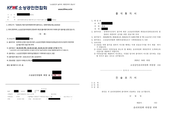 ¼Ò°ø¿¬Àº Áö³­ 3ÀÏ À̵鿡°Ô ¡®Â¡°è°³½Ã½Åû¼­ Á¢¼ö¿¡ µû¸¥ ȸ¿øÀ±¸®°­·É½Çõ±ÔÁ¤ ¹× Á¤°ü À§¹Ý ¿©ºÎ ½É»ç¸¦ À§ÇÑ Áø¼ú±âȸ ºÎ¿©¡¯Çϰڴٴ ÀÌÀ¯·Î Ãâ¼®À» ¿ä±¸ÇÏ´Â °ø¹®À» ¹ß¼ÛÇß´Ù.