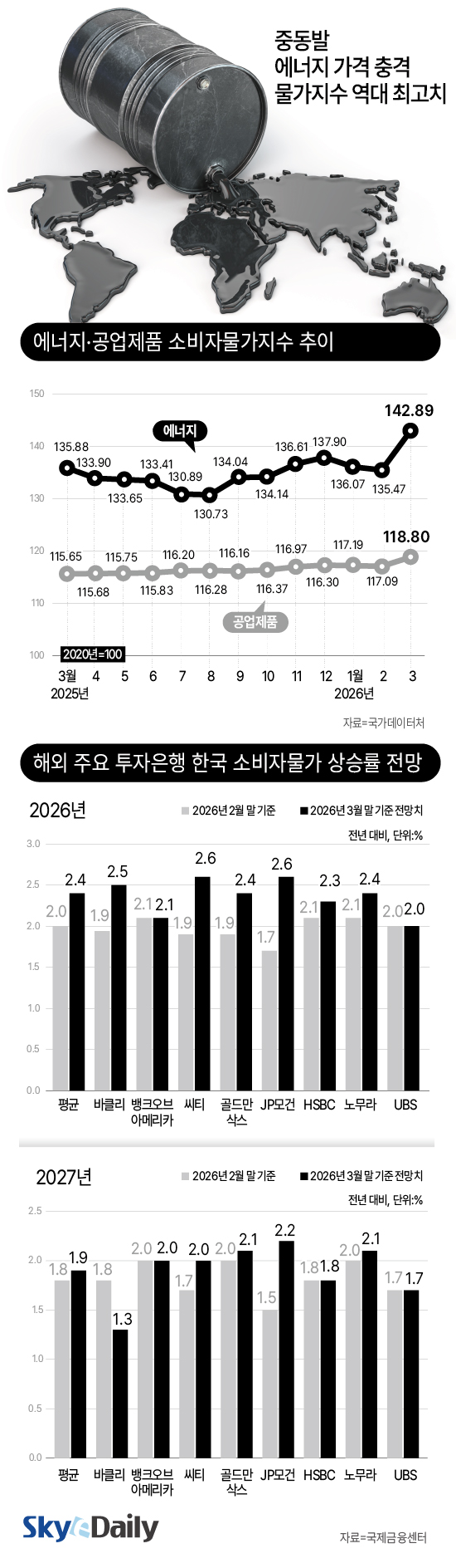 ÇØ¿Ü ÁÖ¿ä ÅõÀÚÀºÇà(IB)µéÀÌ Çѱ¹ÀÇ ¹°°¡ Àü¸ÁÄ¡¸¦ ÀÕµû¶ó »óÇâ Á¶Á¤Çß´Ù. °æÁ¦Çù·Â°³¹ß±â±¸°¡ ¿ÃÇØ ¹°°¡»ó½Â·ü Àü¸ÁÀ» 2.7%·Î ¿Ã¸° µ¥ À̾î IB Æò±Õµµ 2.0%¿¡¼­ 2.4%·Î ³ô¾ÆÁ³´Ù. Áßµ¿¹ß °íÀ¯°¡¿Í ¿ø/´Þ·¯ ȯÀ² 1500¿ø µ¹ÆÄ°¡ ¸Â¹°¸®¸ç ¹°°¡ »ó½Â ¾Ð·ÂÀÌ Ä¿Áö°í ÀÖ´Ù. 5~9¿ù¿¡´Â 3%¸¦ ¿ôµ¹ ¼ö ÀÖ´Ù´Â Àü¸Áµµ ³ª¿Â´Ù. Á¤ºÎ°¡ À¯·ù¼¼ ÀÎÇÏ µî ´ëÀÀ¿¡ ³ª¼¹Áö¸¸ Ãæ°ÝÀ» ¿ÏÀüÈ÷ ¸·±â¿¡´Â ÇѰ谡 ÀÖ´Ù´Â ºÐ¼®ÀÌ´Ù.