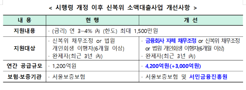 °³Á¤¾È Á¦4Á¶ÀÇ2¿¡ µû¶ó 乫Á¶Á¤À» ÀÌÇà ÁßÀÎ Àú¼ÒµæÃþÀ» À§ÇÑ ±ä±Þ »ýȰÀÚ±Ý Áö¿øµµ °ÈµÈ´Ù. ±×µ¿¾È ½Å¿ëȸº¹À§¿øÈ¸(½Åº¹À§)´Â 乫Á¶Á¤ ÀÌÇàÀÚ¿¡°Ô ¿¬ 3~4%ÀÇ Àú±Ý¸®·Î ¼Ò¾×´ëÃâÀ» Áö¿øÇØ ¿ÔÀ¸³ª, ¹Î°£ º¸Çè»çÀÎ ¼¿ïº¸Áõº¸ÇèÀÇ °ÇÀü¼º °ü¸® µîÀ¸·Î °ø±Þ ±Ô¸ð¸¦ ´Ã¸®´Â µ¥ ÇѰ谡 ÀÖ¾ú´Ù.