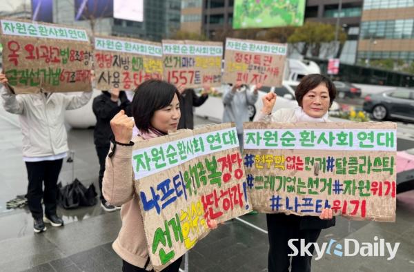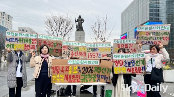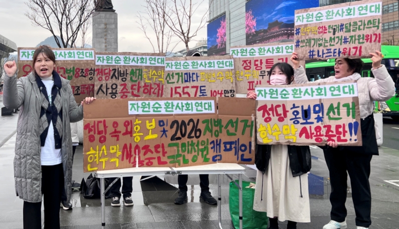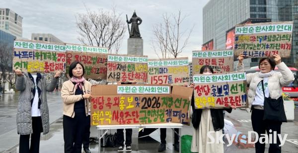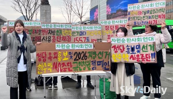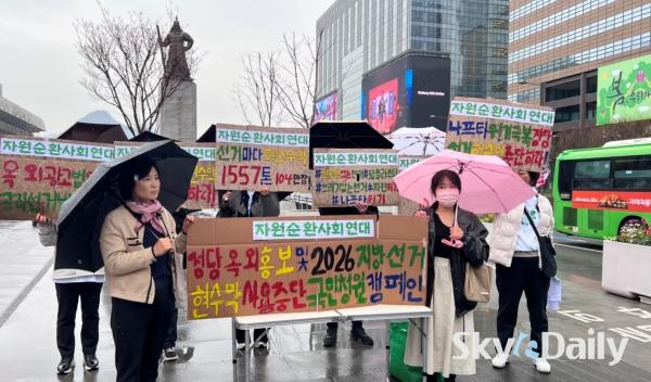 ¡ã ÀÚ¿ø¼øÈ¯»çȸ¿¬´ë °ü°èÀÚµéÀÌ 6ÀÏ ¿ÀÀü ¼­¿ï Á¾·Î±¸ ±¤È­¹®±¤Àå À̼ø½Å µ¿»ó ¾Õ¿¡¼­ ¿Á¿Ü±¤°í¹°¹ý°ú °øÁ÷¼±°Å¹ý °ü·Ã Á¶Ç× ÆóÁö¸¦ Ã˱¸ÇÏ´Â Ä·ÆäÀÎÀ» Çϰí ÀÖ´Ù. À̵éÀº ÃÖ±Ù Áßµ¿ ÀüÀï ¿©ÆÄ·Î Á¤ºÎ¿Í ±¹¹Î¡¤¹Î°£±â¾÷ ÀÌ ¾ÕÀå¼­¼­ ¼®À¯¡¤°¡½º ¹× ³ªÇÁŸ »ç¿ëÀ» ÁÙÀÌ·Á´Â ³ë·ÂÀ» Çϰí Àֱ⿡, ±¹°¡·ÎºÎÅÍ È«º¸ Çö¼ö¸· ƯÇý¸¦ ¹ÞÀº Á¤Ä¡ÀεéÀº ¼Ö¼±¼ö¹üÇØ¼­ ¼±°Å Çö¼ö¸· Á¤Ä¡¸¦ ´çÀå Á¾·áÇØ¾ßÇÑ´Ù°í ÁÖÀåÇß´Ù. º» ´Üü´Â °øÁ÷¼±°Å¹ý ¹× ¿Á¿Ü±¤°í¹ý °³Á¤À» À§ÇØ ±¹¹Îû¿øÀ» ÁøÇàÇÒ ¿¹Á¤ÀÌ´Ù.  ÀÚ¿ø¼øÈ¯»çȸ¿¬´ë